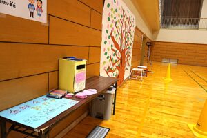 学習発表会に向けて、子供会執行部が企画した「みんなのかがや木」が体育館の壁に掲げられています。