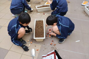 花とみどりの少年団の5・6年生が、春に向けてチューリップの球根を植えました。
