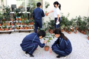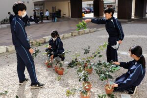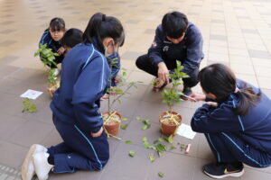 6年生と7年生は南砺学の時間に、椿の剪定の留意点は何か、水やりのタイミングはいつかなどを確認し、ペアになって作業を行いました。剪定は、先週取り木をして植えた鉢と、これまで育ててきた椿の鉢の両方に対して行いました。