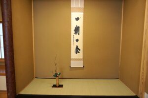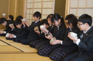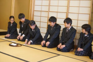 子供たちは、事前に動画や資料を通して「茶道のこころ」について学習してから、この日を迎えました。和室に入ると、床の間に軸が掛けられていたり、茶道の茶碗、お菓子等が用意されていたり、講師の方による丁寧な準備がされていたことを知り、大変感動していました。
