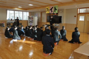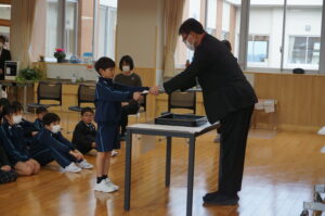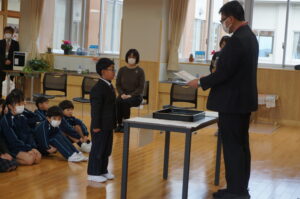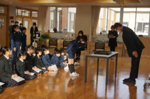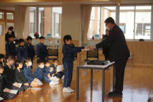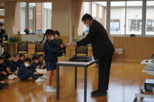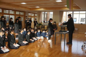 中等部ホールで校内書初大会の授賞式を行いました。金賞を受賞した12名の子供たちが、校長先生から賞状を手渡されました。どの子供も大きな声で返事をし、堂々と賞状を受け取っていました。