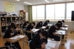 7年生と5年生では、これまでの学習の確かめのためにNRT検査を実施します。今日実施した国語や英語(7年生のみ)には聞き取り問題もあり、一生懸命メモを取りながら聞いていました。明日以降に残りの教科を行います。これまでの学習を振り返り、新しい学年での学びへとつなげる機会にしてほしいです。