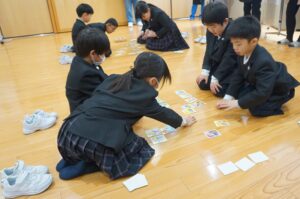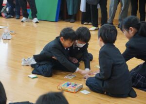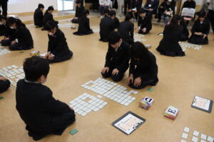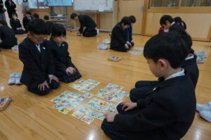 多くの保護者の皆様に見守られ、低学年ホールでは子供たちが真剣な表情で札を取っていました。札が読まれるたびに、「はい!」という大きな声が響き、元気よく手を伸ばす姿が見られました。