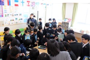 ・アート部英語コースでは、ALTとの英語だけのやり取りやカードゲームの様子を楽しそうに見つめ、カードを見せてもらって参加する子供もいました。