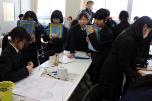 ・アート部美術コースでは、静物画に集中する先輩や自由な発想の作品に興味津々で、描き方をじっと観察する姿が見られました。