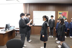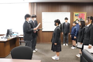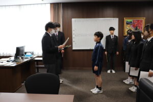 昼休みに、校長室で子供会役員の当選証書授与式を行いました。選挙管理委員長から各当選者に当選証書が授与されました。その後、校長先生から任命書を手渡され、どの子供もこれから子供会執行部としてがんばろうという意欲をみせていました。