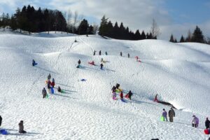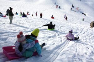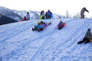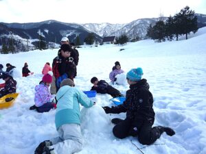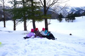 子供たちは満面の笑顔で、ゴルフ場の広い雪原を思いきり駆け回り、斜面をソリで滑ったり、雪投げをしたりして、冬ならではの遊びをダイナミックに楽しみました。
