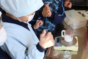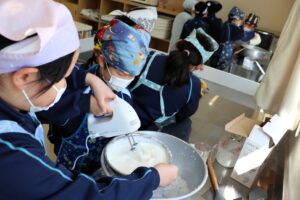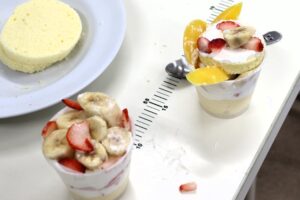 砂糖等の材料の重さを量ったり、生クリームのかさを計量カップで量ったり、ハンドミキサーで生クリームを泡立てたり、包丁で果物を切ったりと、それぞれが役割をもち、班のメンバーで協力して仕上げました。