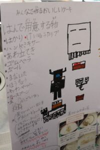 子供たちは、事前に班でどんな仕事を分担するか話し合い、当日スムーズに活動できるよう準備を進めてきました。お菓子屋さんからカップケーキのレシピを教えてもらい、準備物や調理手順をポスターにまとめて調理を始めました。