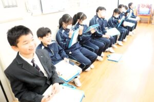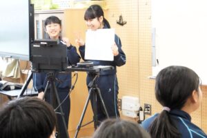 今回は、5人の6年生の「将来なりたい職業」を当てるクイズを行い、他の5,6年生が “He can jump high.” “She is kind.” など、これまでに習った表現を使って得意なことや人柄を紹介しました。
