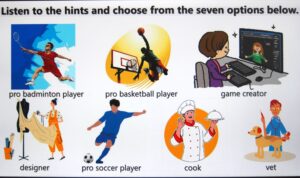 カウアイ島の友達は7つの選択肢から答え、間違った時には6年生が自然と “No, sorry.” と返す姿も見られました。正解時には “Yes, I want to be a ○○.” と夢の職業を伝えることができ、2年間の学習と交流で培った表現を実際に使うなど、成長が感じられました。