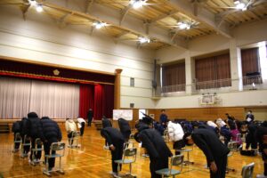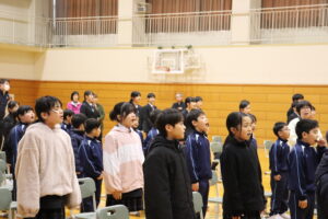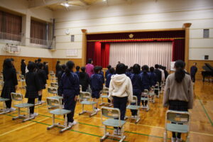 3月12日(木)に行われる卒業式に向け、1~6年生は体育館で初めて式の流れの確認や、送辞、式歌の練習を行いました。
