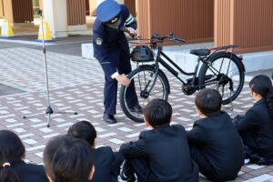 3・4年生が、自転車に乗る前の点検方法やヘルメット着用の大切さ、歩道や道路での正しい走行のしかたについて、講話と実技を通して学びました。子供たちは交通ルールを意識し、安全に走行しようとする姿が見られました。