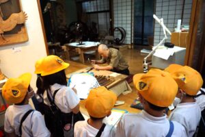 八日町通りでは、職人さんの仕事場を見学し、「何年続けていますか?」「作品の値段はどのように決まりますか?」と率直な質問も出ました。通りに飾られた猫の木彫り探しも楽しみました。