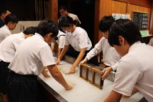 五箇山和紙の里で、紙すき体験をしました。まず「五箇山和紙ができるまで」のビデオ鑑賞をしました。紙の原料となる楮(コウゾ)から丁寧にこだわりをもって栽培し、雪深く豊かな水に恵まれた土地で400年以上伝わる和紙作りの技術を継承していることを知りました。