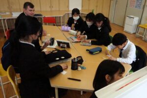 アート部英語コースでは、自分用の名札作りや外国クイズづくりを通して交流を深めました。