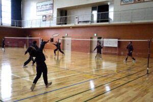 バドミントン部では、初心者でも打ち返しやすいように先輩がやさしくシャトルを打つ姿が見られました。